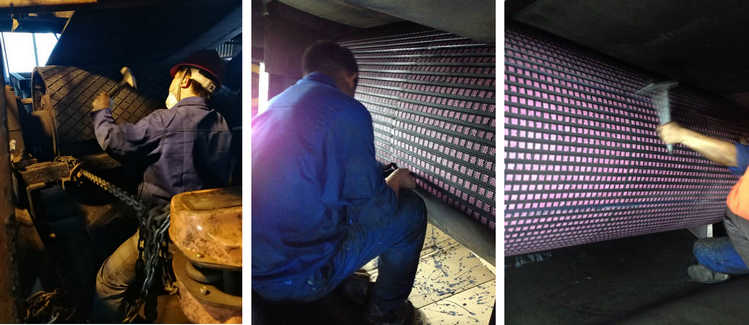 耐磨陶瓷滾筒包膠后,還需將滾筒現場恢復原樣。更關鍵是施工時間非常緊, 為不影響客戶生產,精城施工隊每24小時需要完成一個滾筒的包膠。