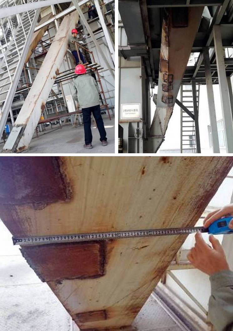 如圖所示,這個下料溜槽磨損嚴重,以前采用的8mm厚的普通鋼板,不到1年就磨穿了。高度近7米,斜面長近9米,落差高,顆粒大,爐渣內有10mm左右的大顆粒,因為原煤里有煤矸石沒有被完全燃燒,所以造成溜槽底側嚴重漏粉,經常被磨穿。了解到這些情況后,湖南精城特種陶瓷有限公司的技術專家結合現場的工況,給出了解決方案,整體分段制作溜槽,在每段流槽的磨損面粘貼精城牌大塊厚瓷(NMC-G耐磨陶瓷),各段之間采用法蘭連接,此方案經濟又環保,使用壽命在6年以上。