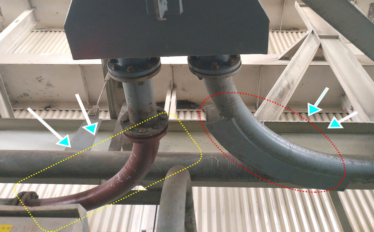 在收到客戶電話后,我司便立馬安排經驗豐富的技術人員和業務經理一同驅車前往客戶現場。經過近10個小時的舟車勞頓,我們最終順利抵達目的地。第二天清早,在客戶的帶領下我們共同前往現場進行管道勘測。客戶表明此次待更換的石灰石輸送管道沒有詳細圖紙,具體尺寸還需經過實地測繪才能得出。由于電廠管道線路排布比較特殊,石灰石輸送管道也通常位于架空橋架中,這給現場測繪帶來了巨大的挑戰。在對現場進行仔細勘察后,我們最終決定在待測的管線旁搭建人工作業平臺,以此為測繪人員提供安全的落腳支撐點。待所有準備工作完畢后,精城特瓷的技術員穿上高空防墜服,系上安全繩,在發電廠維修部蘇工的帶領下小心翼翼地登頂作業平臺進行管道測繪。